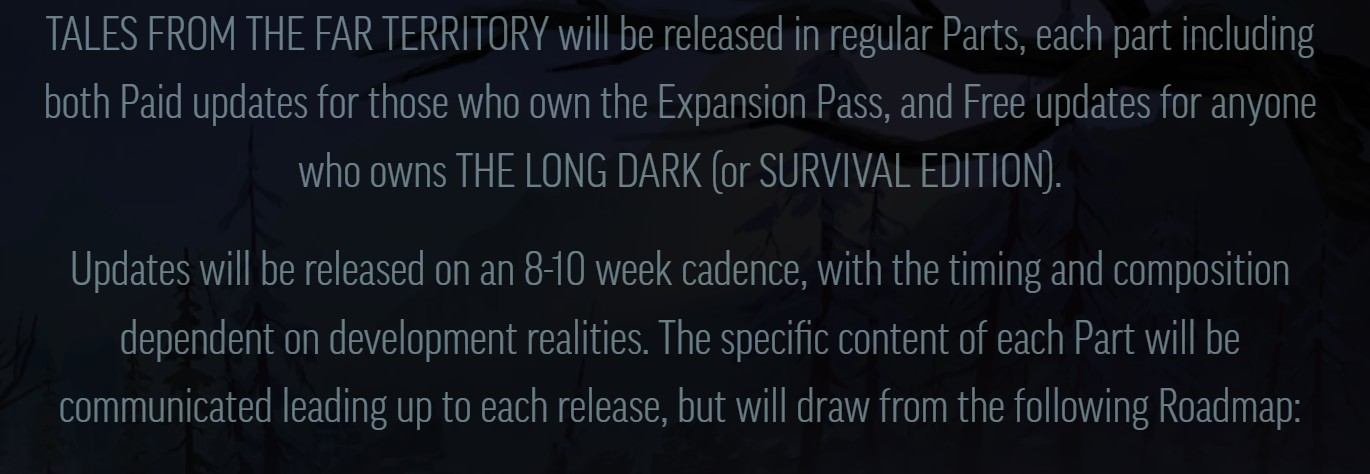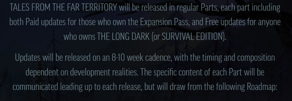 Ранее авторы The Long Dark рассказали о том, что пересмотрели модель поддержки игры. С 2014 года минуло 8 лет и в апреле 2022 года сообщили о решении выпустить первое платное дополнение, всё это время предлагали бесплатные обновления.