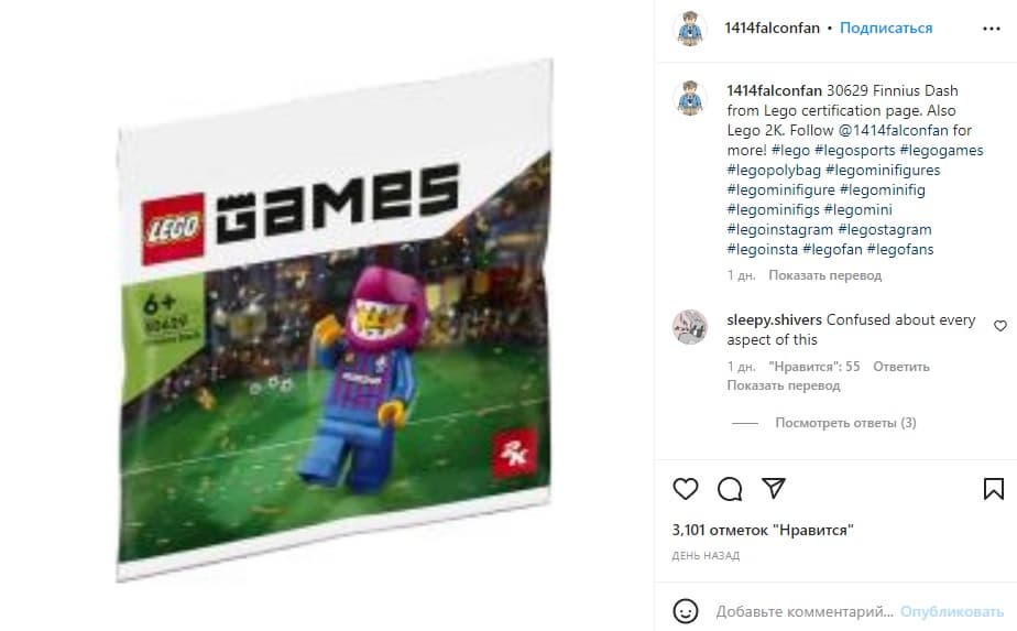 Журналист VGC Крис Скаллион, представил новую сертифицированную минифигурку LEGO, на которой изображен футболист в майке футбольного клуба «Барселона» с кепкой в виде акульей головы. Изображение появилась в профиле 1414falconfan, где публикуются утечки о серии LEGO.