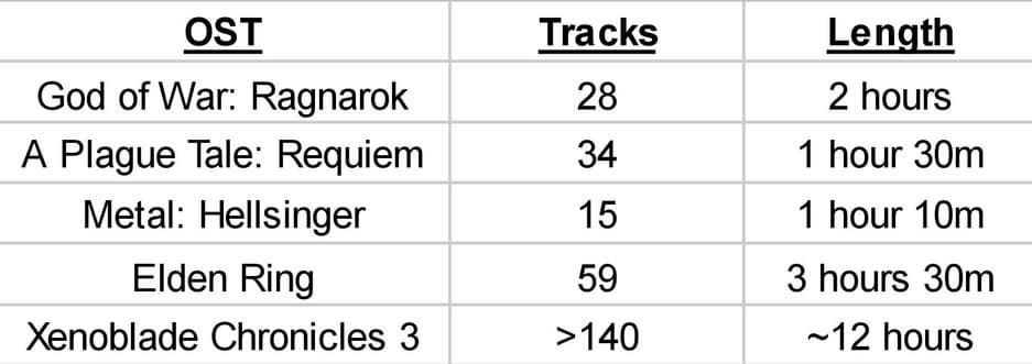 Почти у всех номинантов музыка длится от одного до трёх часов, а лидирует по продолжительности Elden Ring – 3,5 часа с 59 треками. Но саундтрек Xenoblade Chronicles 3 насчитывает более 140 композиций и длится 12 часов.