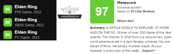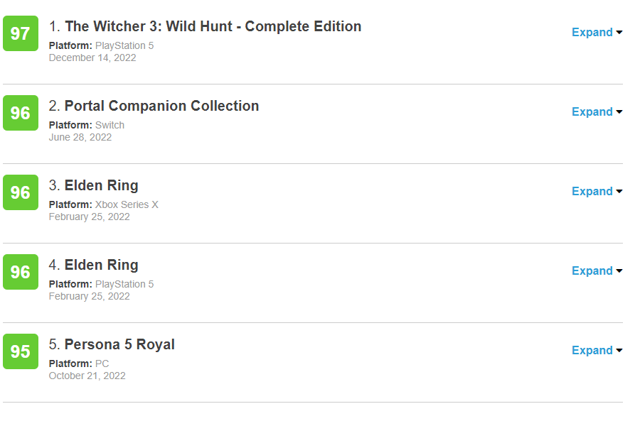 The Wtcher 3 Wild Hunt Complete Edition получила первые оценки и вырвалась на вершину списка Metacritic. Как оказалось, по средней оценке обновлённая версия «Ведьмака 3» обошла Elden Ring. Это случилось как раз под конец 2022 года.
