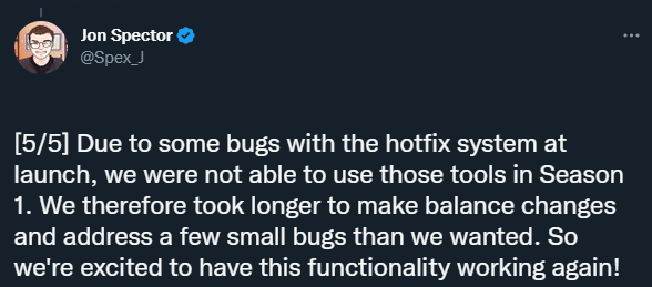 Спектор рассказал, что у Blizzard есть инструмент для хотфиксов, который позволяет вносить небольшие изменения в Overwatch 2 (исправление коллизии на карте, корректировка цифр для баланса героев) сразу после тестирования. Однако, в первом сезоне Overwatch 2 в системе хотфиксов были некие баги, которые мешали использовать систему.