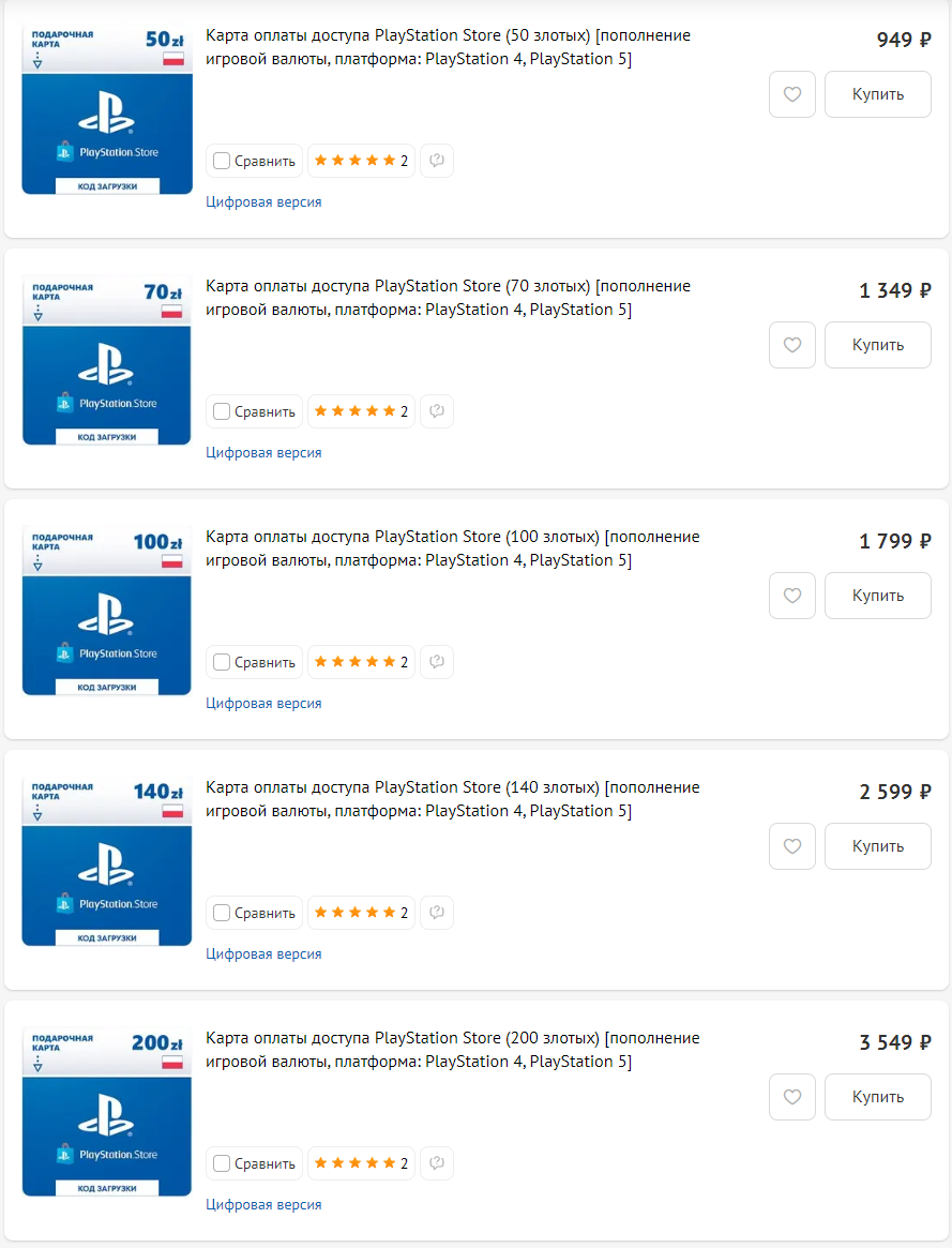 Стоимость карт оплаты для польского PlayStation Store: