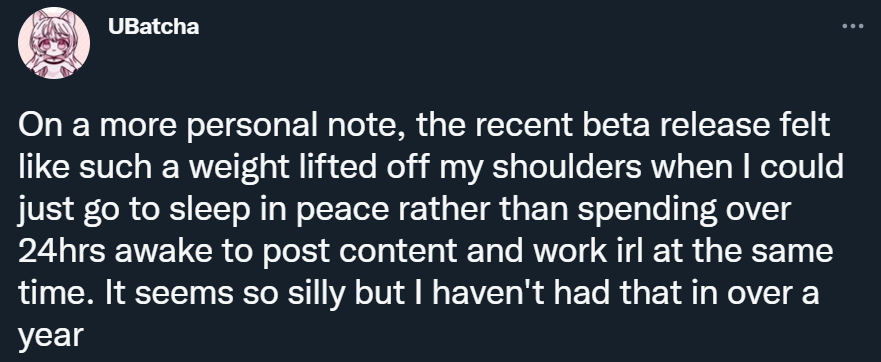 UBatcha от этой ситуации только лучше. Теперь он может спокойно поспать, а не совмещать основную работу и публикацию контента по Genshin Impact. Он больше года жил в бешенном ритме.