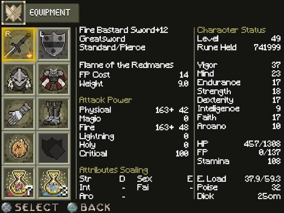 Как и в случае со многими другими демейками, узнаваемые черты Elden Ring проглядываются даже после такого «ухудшения» графики. Инвентарь и иконки предметов довольно удачно стилизованы.
