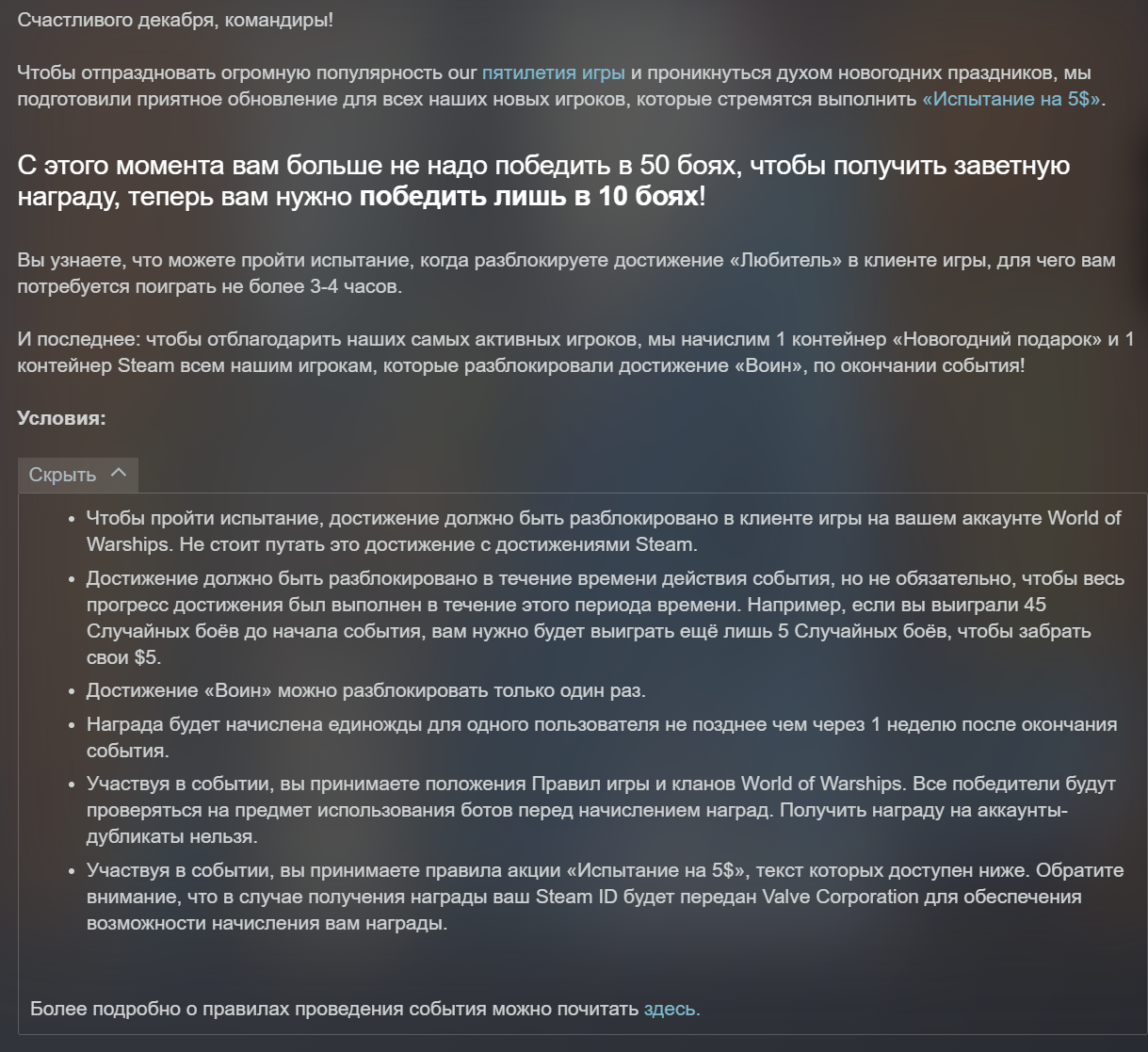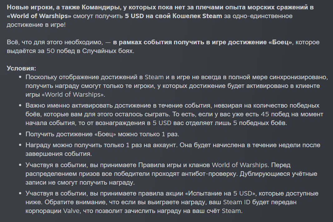 В Steam-версии World of Warships провели необычную акцию. Wargaming Group Limited предложила выполнить задание и в награду получить 5 долларов на баланс Steam.
