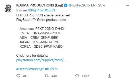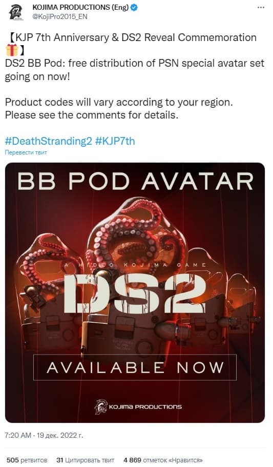 В честь седьмой годовщины компании Kojima Productions и официального анонса Death Stranding 2 у сообщества PlayStation есть возможность получить специальные аватары. DS2 BB Pods можно забрать бесплатно через сеть PlayStation.