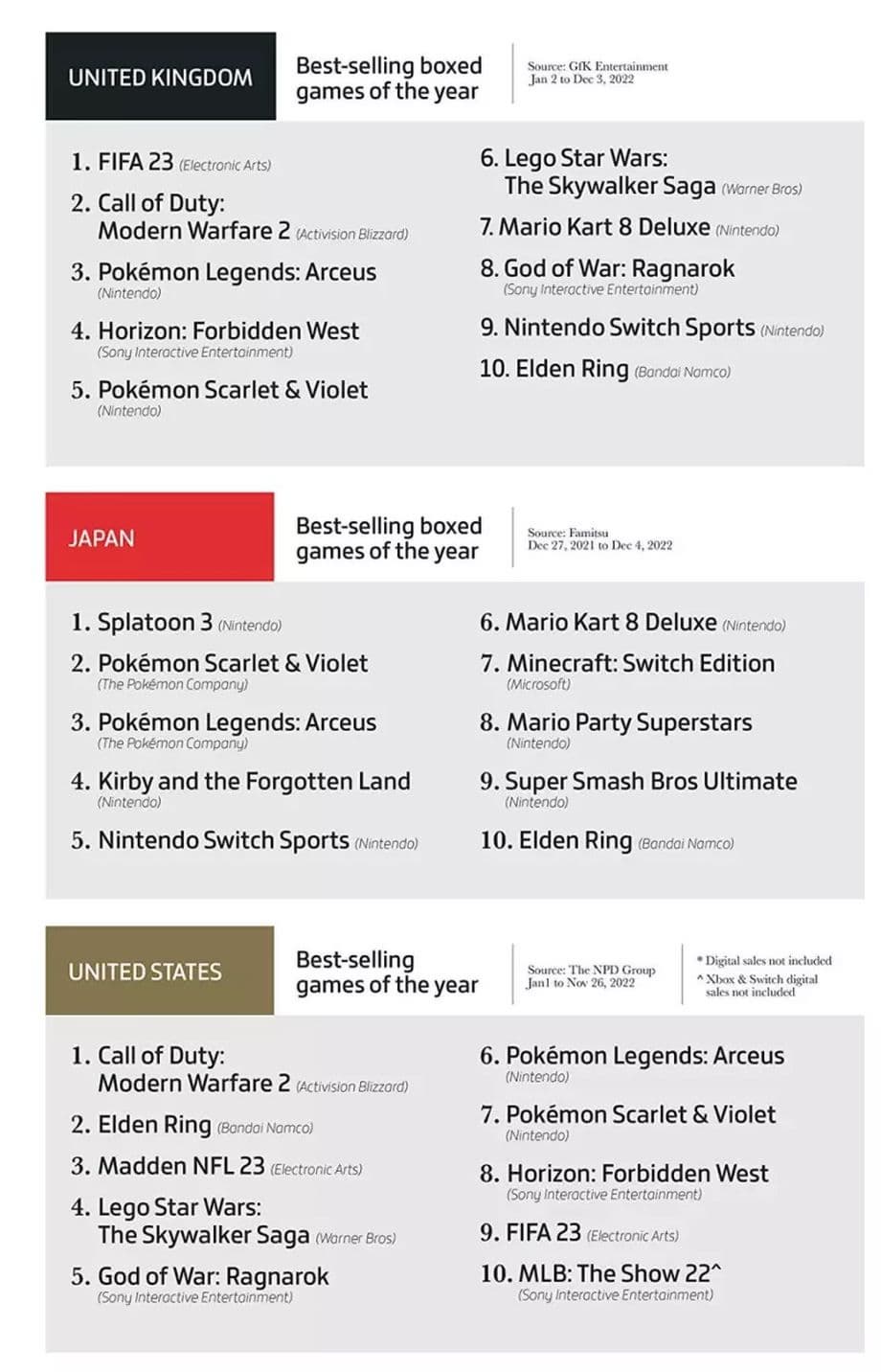 На каждом рынке самыми покупаемыми были разные продукты: в Великобритании – FIFA 23, в Японии – Splatoon 3, в США – Call of Duty: Modern Warfare 2.