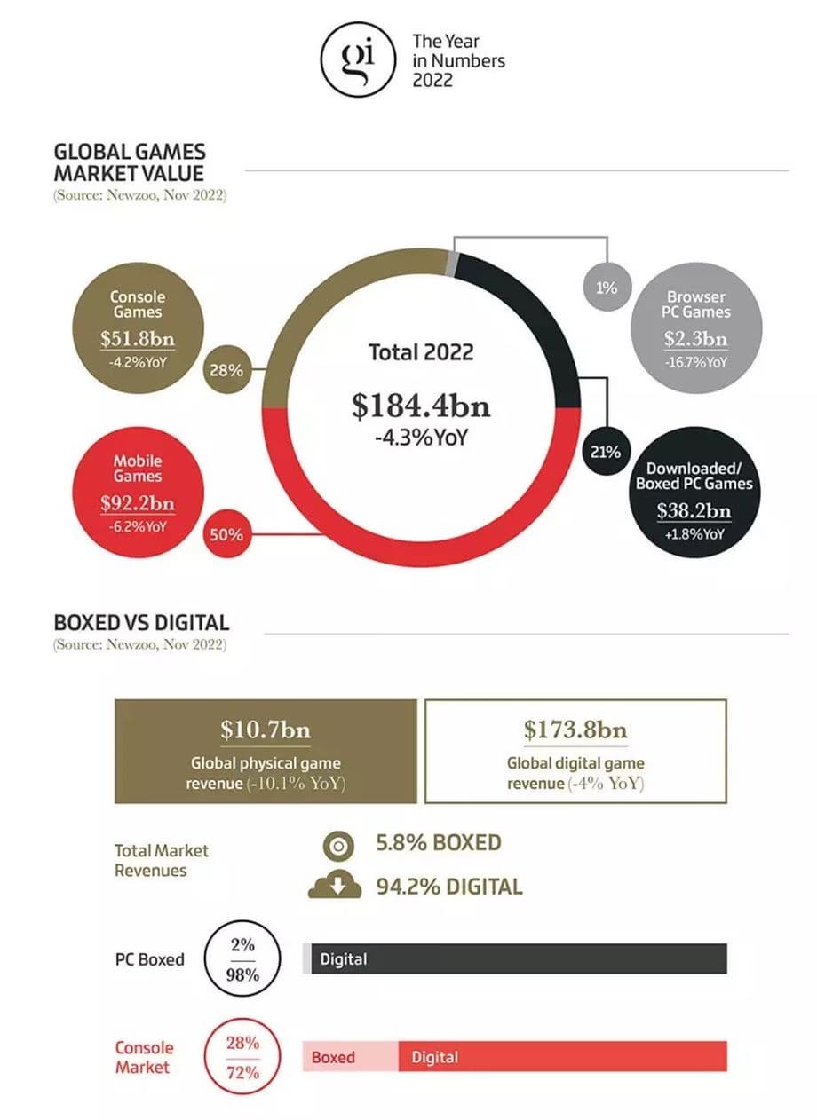 По данным Gamesindustry, мировая стоимость индустрии игр в 2022 году составит $184,4 млрд, что на 4,3% меньше, чем в прошлом году. 50% результата приходится на рынок мобильных устройств (92,2 млрд, -6,2% по сравнению с 2021 годом), затем следуют консоли (28%, 51,8 млрд, -4,2% по сравнению с 2021 годом) и только потом игры для ПК (21%, 32,8 млрд, +1,8 млрд по сравнению с 2021 годом).