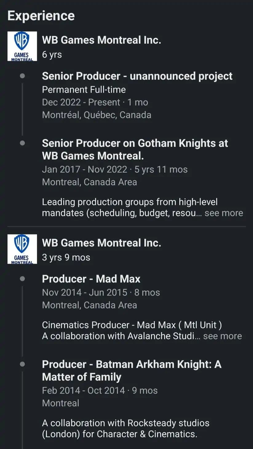 Брайан Теберге, проработавший в WB Games Montreal более девяти лет в качестве продюсера и старшего продюсера, обновил профиль на Linedin, добавив ещё одну игру. В декабре разработчик занял должность старшего продюсера в неанонсированном проекте, дав понять, что студия реорганизует специалистов.