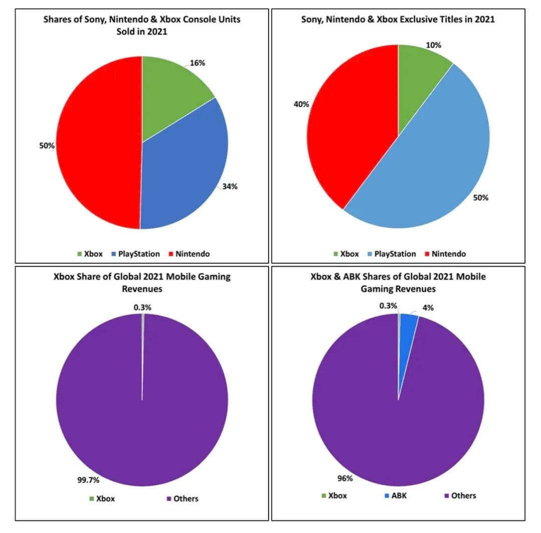 Корпорация даже составила несколько показательных графиков, которые подтверждают, что в 2021 году было продано значительно меньше консолей Xbox, чем у Sony и Nintendo, и вышло меньше эксклюзивных игр.