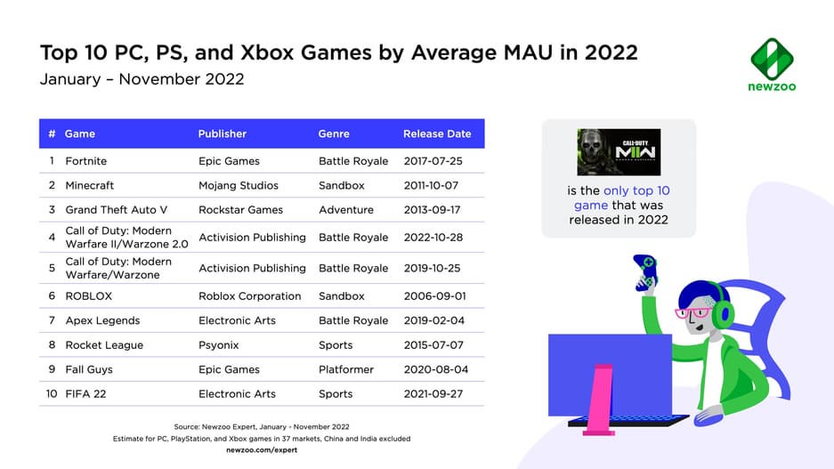 Кроме того, отчет показывает, что в 2022 году доминировали условно-бесплатные продукты, как правило, выпущенные несколькими годами ранее. Релиз самой старой состоялся в 2006 году. Единственная игра в списке, выходившая за последние одиннадцать месяцев – Call of Duty: Modern Warfare II, а также условно-бесплатная CoD: Warzone 2.