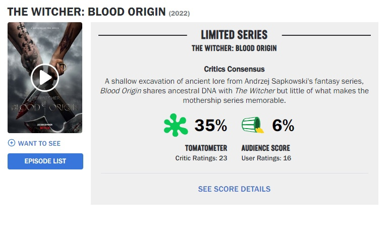 Состоялась премьера сериала The Witcher Blood Origin (или «Ведьмак Происхождение») на Netflix. Появились первые оценки на Rotten Tomatoes.