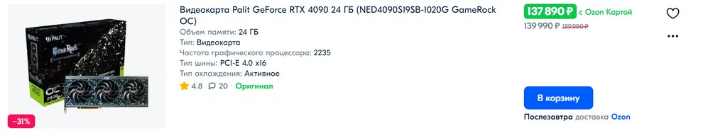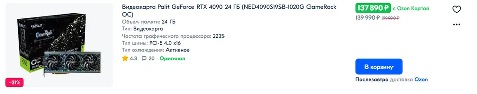 Если доплатить 20 тысяч, то на Ozon можно найти GeForce RTX 4090 24 ГБ.