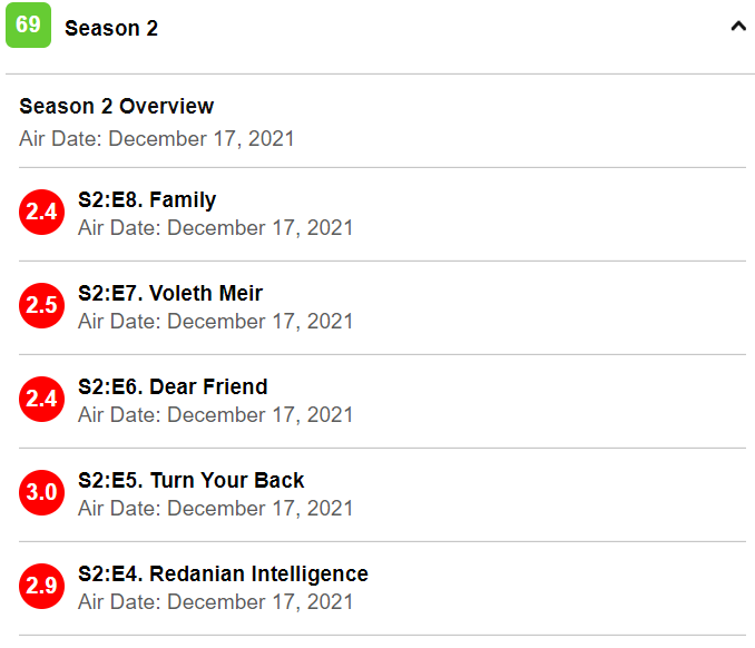 Второй сезон сериала по The Witcher с Геральтом в исполнении Генри Кавилла тоже критиковали, но даже самые спорные серии в итоге имеют более 2 баллов на Metacritic, а общая оценка в «зелёной» зоне. На Rotten Tomatoes тоже неплохой зрительский рейтинг — 90% у первого сезона и 59% у второго.