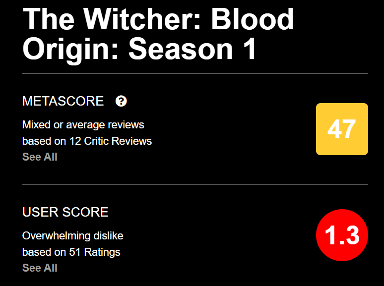 На Metacritic у сериала тоже всё плохо. «Ведьмак Происхождение» получил 1.3 балла из 10 после более чем 50 оценок.