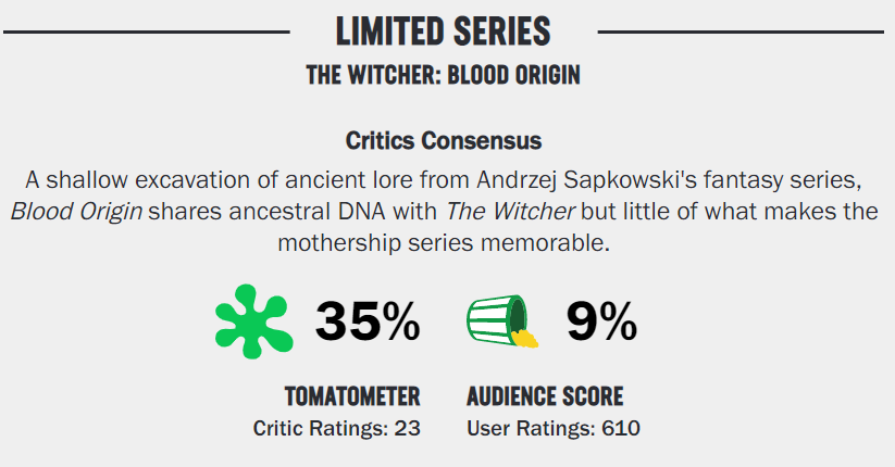 Зрители тоже остались не в восторге от сериала Netflix. Первые зрительские оценки «Ведьмака Происхождение» на Rotten Tomatoes позволили сериалу получить 6% рейтинга. Затем он подрос, а теперь опустился до 9% после более чем 600 оценок.