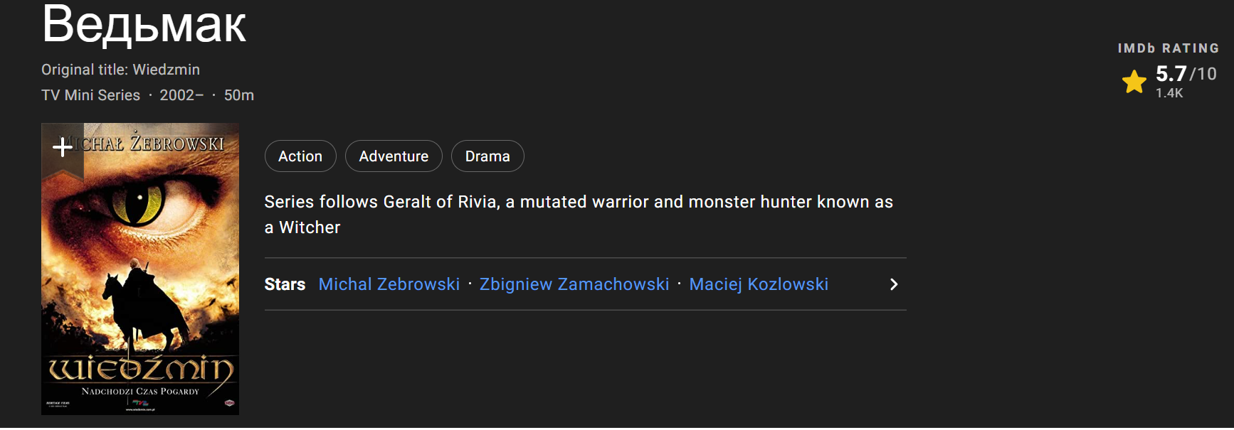 У старой экранизации Wiedzmin рейтинг IMDB всё же повыше: 5.7 из 10.