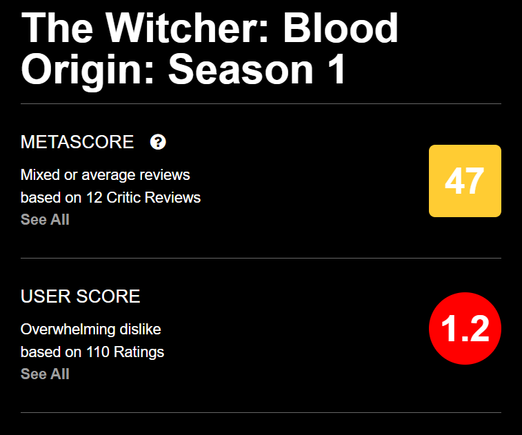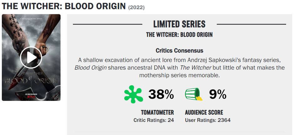 На текущий момент у сериала «Ведьмак Происхождение» на Rotten Tomatoes 9% зрительского рейтинга и 38% от критиков.