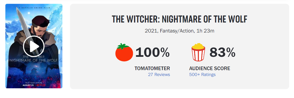 Сообщество The Witcher заметило, что The Witcher: Nightmare of the Wolf («Ведьмак: Кошмар волка») на Rotten Tomatoes получил 83% от зрителей.