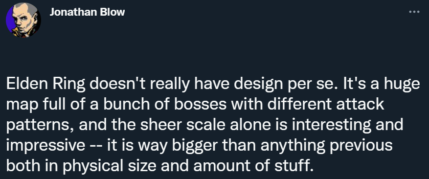 Создатель The Witness и Braid Джонатан Блоу (Jonathan Blow) присоединился к дискуссии о качестве дизайна Elden Ring. Он его в игре не увидел вообще.