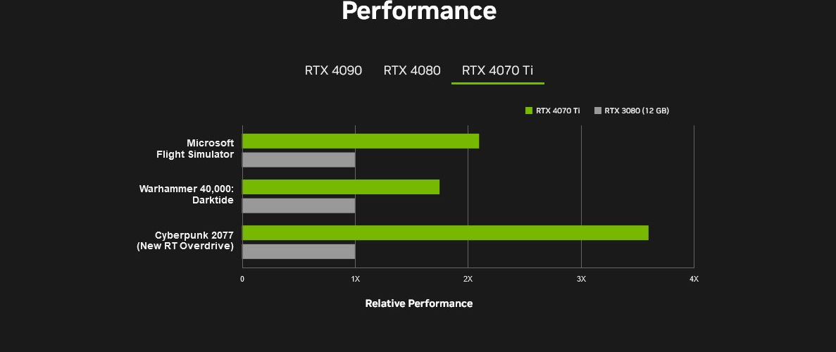 Согласно опубликованным NVIDIA тестам, видеокарта GeForce RTX 4070 Ti способна превзойти GeForce RTX 3080 в 3.5 раза при некоторых условиях. В целом превосходство современной видеокарты по производительности колеблется примерно от 1.5 до 3.5 раза.