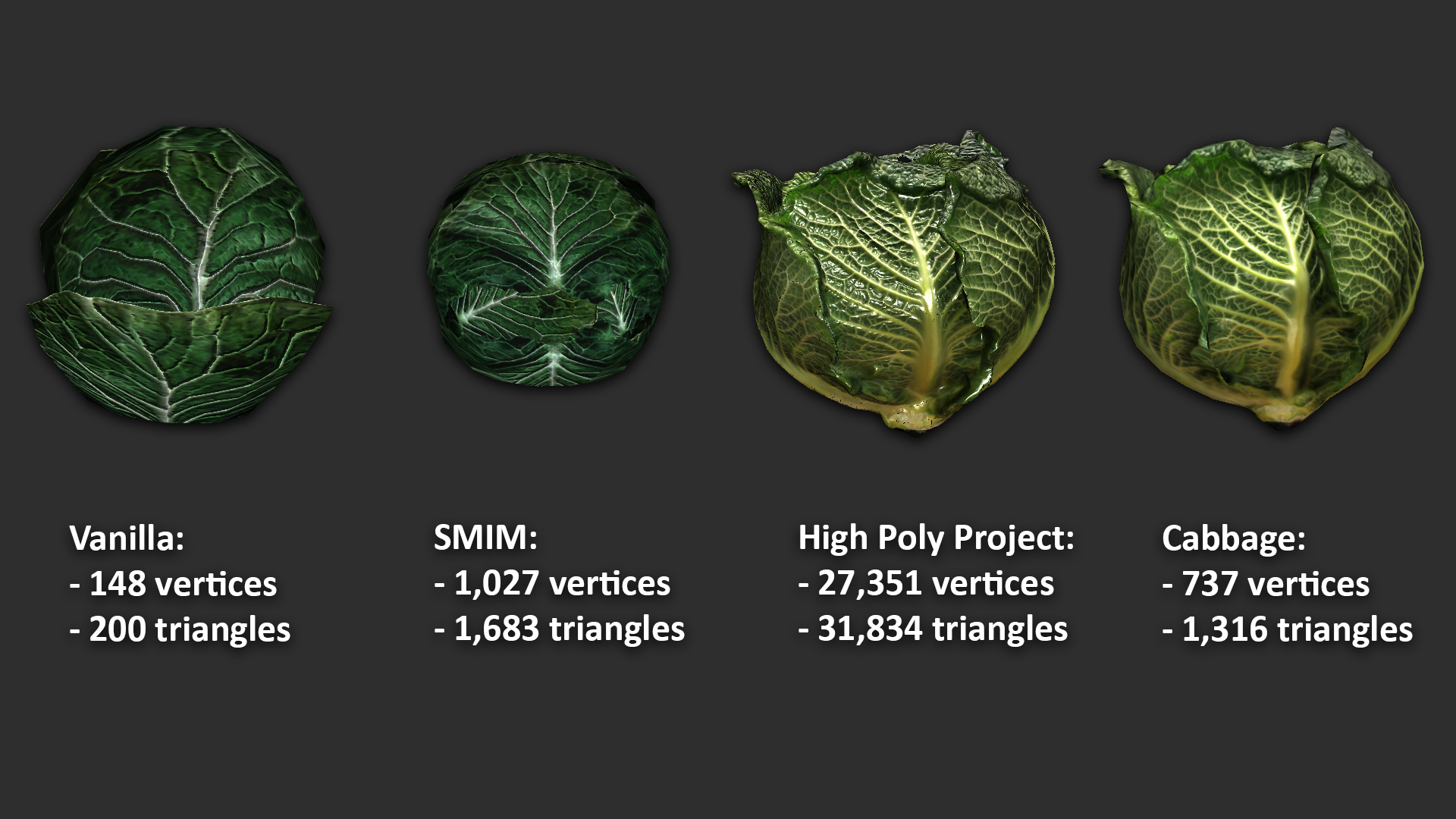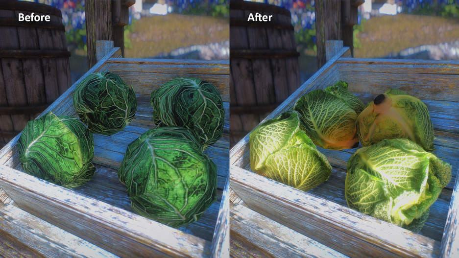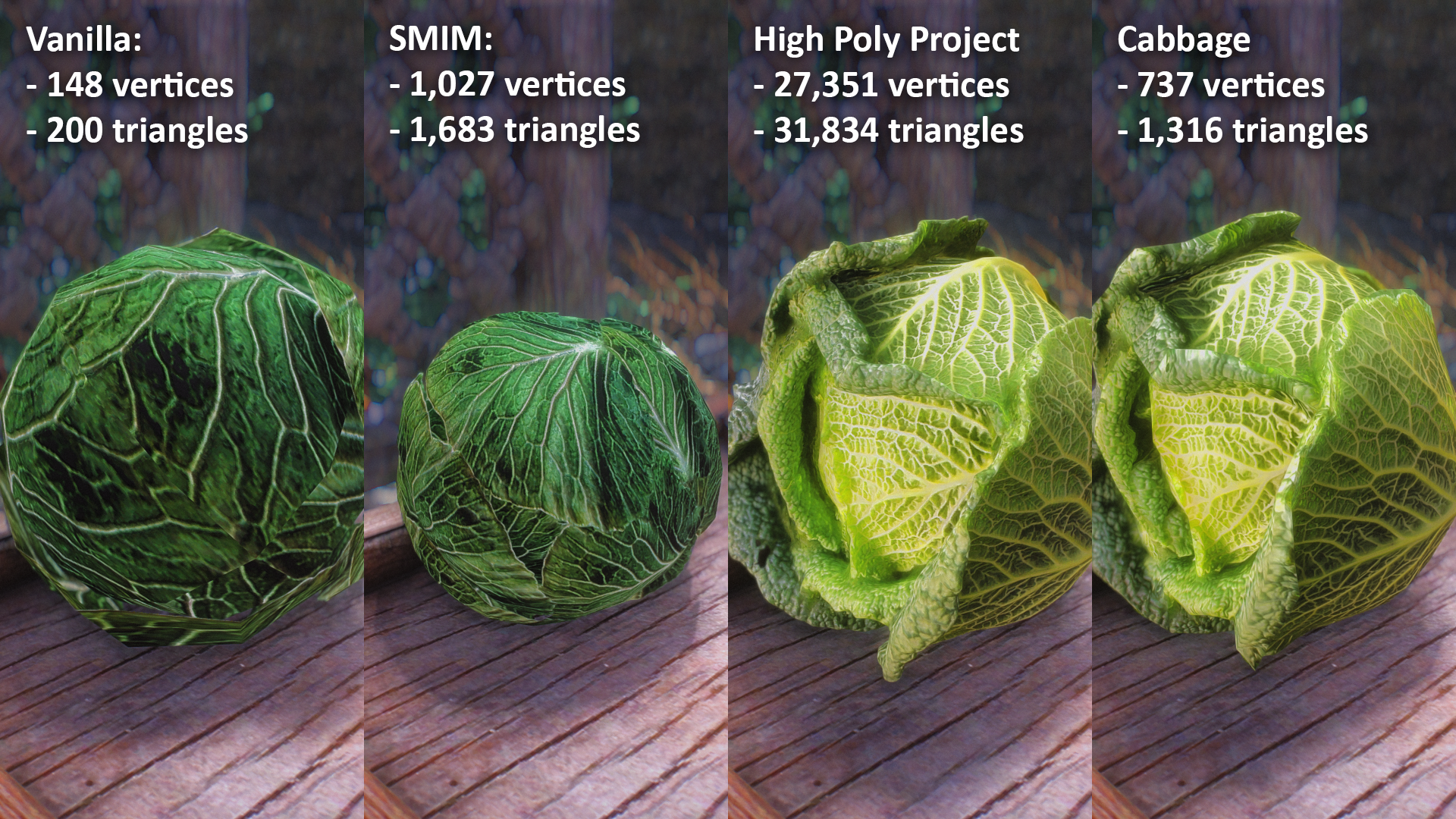 Похорошевшая капуста заметно отличается от оригинальной. Kreiste опубликовал несколько изображений и указал количество треугольников и вершин. С посаженной версией капусты ничего сделать не удалось, у Kreiste не нашлось подходящих ассетов.