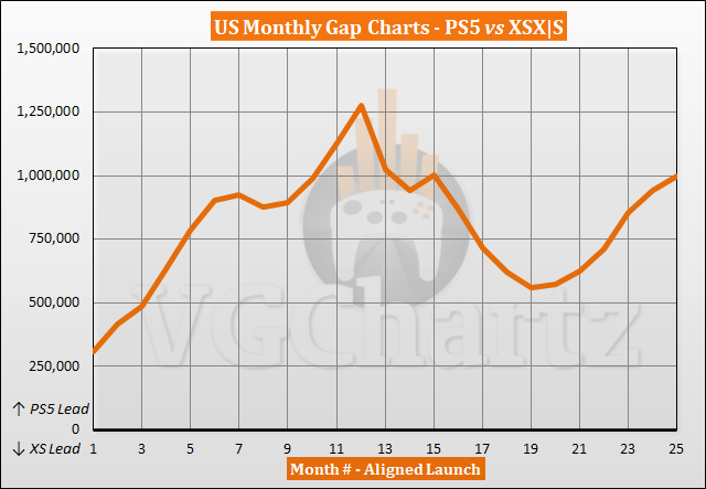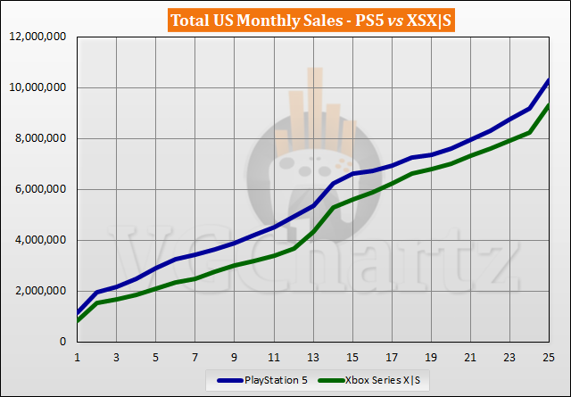 В VGChartz сравнили продажи консолей нового поколения PlayStation 5 и Xbox Series X|S в США спустя 25 месяцев (обе консоли выпустили в ноябре 2020 года). Приводятся примерные цифры.