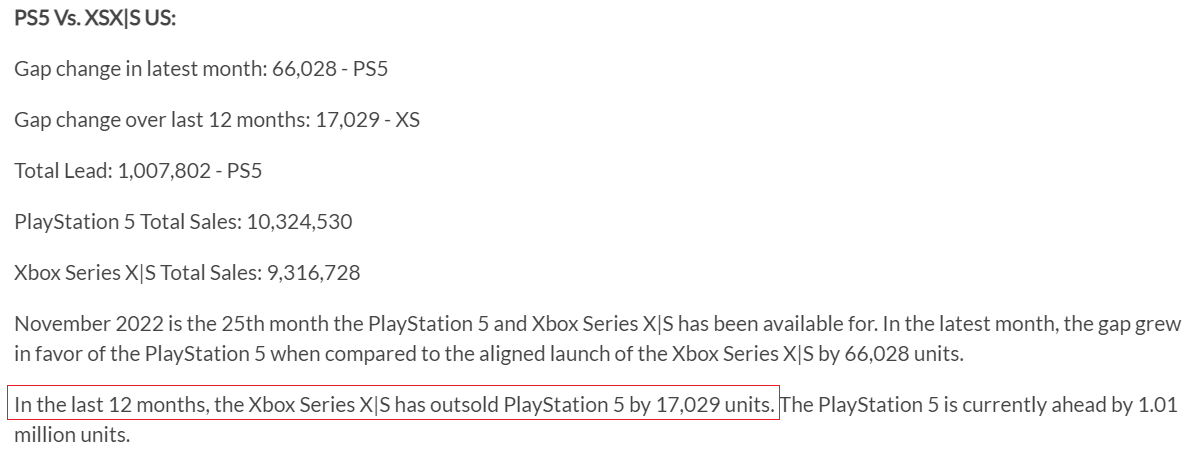 Заметили, что: «За последние 12 месяцев продажи Xbox Series X|S превысили продажи PlayStation 5 на 17 029 единиц» (Хотя PS5 по-прежнему доминирует по общим продажам).