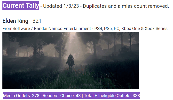Энтузиаст под ником BrickArts295 запустил исследование, посвящённое подсчёту наград «Игра года», полученных Elden Ring и другими играми 2022 года. Удалось установить, что Elden Ring получила высокую награду рекордное количество раз.