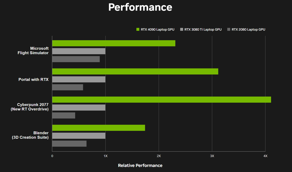 Ноутбуки с RTX 40 позволят играть в Cyberpunk 2077 и не только. NVIDIA сравнила производительность мобильной RTX 4090 с мобильными RTX 3080 Ti и RTX 2080.