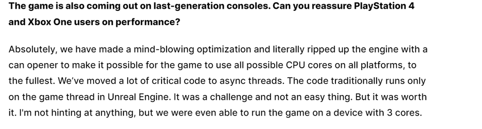 Mundfish заверила, что с оптимизацией всё очень хорошо: «…мы провели умопомрачительную оптимизацию и буквально разорвали движок консервным ножом, чтобы игра могла использовать все возможные ядра процессора на всех платформах в полной мере. Мы перенесли много критически важного кода в асинхронные потоки. В Unreal Engine код традиционно выполняется только на игровом потоке. Это был вызов и нелёгкое дело. Но оно того стоило. Я ни на что не намекаю, но мы даже смогли запустить игру на устройстве с 3 ядрами».