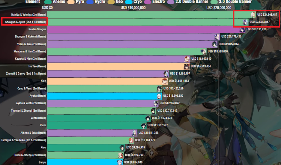 Статистика баннеров Genshin Impact показала, что Сёгун Райдэн и Камисато Аято приближаются по уровню доходов к показателям баннера Нахиды.