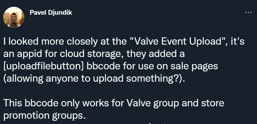 Возможно, всё куда банальнее. Создатель SteamDB Павел Дюндик (Pavel Djundik) попытался разобраться в вопросе и написал в социальной сети: «Я изучил "Valve Event Upload", это appid для облачного хранилища, они добавили [язык разметки] bbcode [uploadfilebutton] для использования на страницах магазина (позволяя любому загрузить что-то?)».