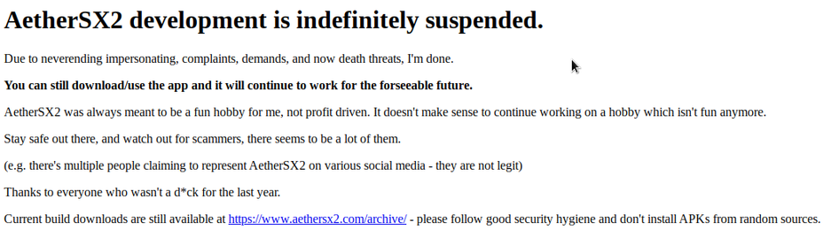 «Из-за непрекращающихся подделок, жалоб, требований, а теперь и угроз убийством, с меня хватит. Вы все еще можете загружать приложение и оно будет работать некоторое время. Для меня AetherSX2 всегда был хобби для развлечения, а не для получения прибыли. Какой смысл заниматься хобби, которое больше не приносит удовольствие. Подумайте о безопасности и остерегайтесь мошенников, их, похоже, много (так, несколько человек в социальных сетях представляются авторами AetherSX2. Это незаконно). Спасибо всем, кто в прошлом году не был муд***м».