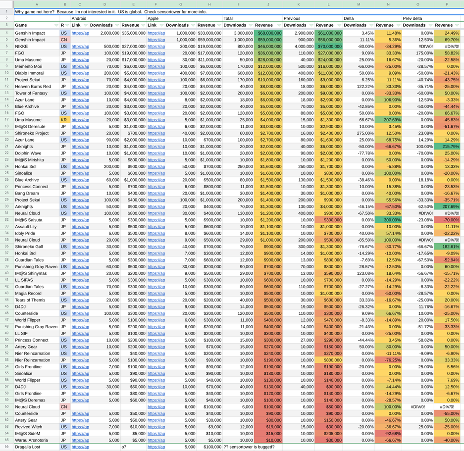 Богини победы NIKKE, в прошлом месяце опередившие Genshin Impact оказались на втором месте, заработав на обоих платформах 46 миллионов долларов США и были скачаны 800 тысяч раз.