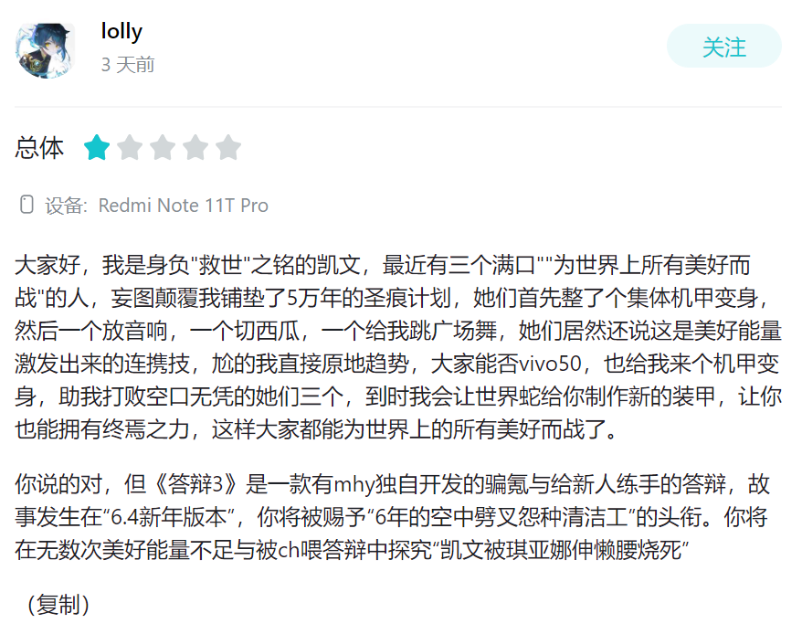 Авторы негативных обзоров теперь оставляют фразы в духе «凯文被琪亚娜伸懒腰烧死», что можно перевести примерно как «[противник] сожжён растяжкой», что отсылает к элегантному движению героини.