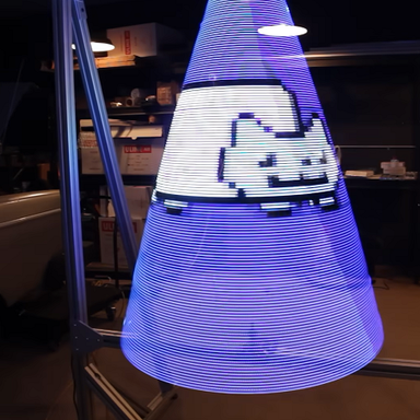 Технически, эта ёлка всё же не полноценная голограмма. Конструкция состоит из планок со светодиодами, которые очень быстро вращаются. Быстрая смена цветов создаёт иллюзию голограммы.