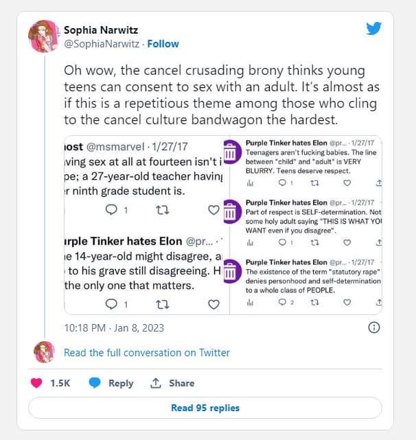 Журналистка Софиа Нарвиц изучила историю публикаций Purple Tinker hates Elon и обнаружила комментарии, в которых он призывал нормализовать сексуальную близость между взрослыми и 14-летними подростками.