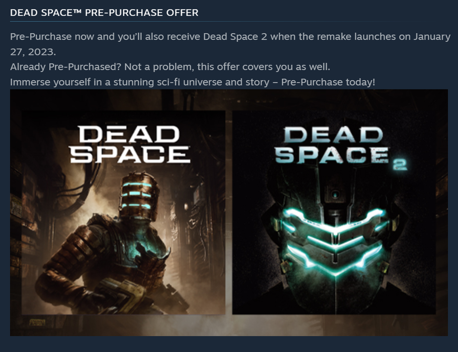 Получается, что предзаказавшие ремейк Dead Space технически «сэкономят» 20 долларов («40$ за ремейк и 20$ за DS2»). Воспользовавшись такой «скидкой», пользователи смогут начать играть в ремейк на релизе, при этом получив в библиотеку Steam сиквел. В противном случае пришлось бы отдать 80 долларов. В PS Store о такой акции не сообщают.