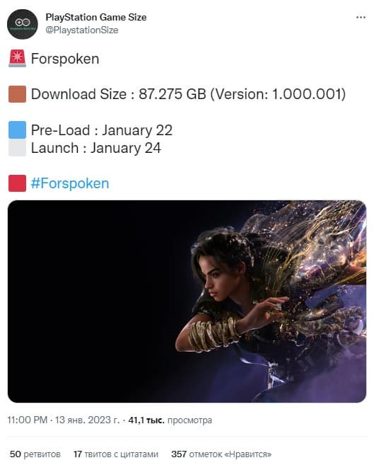 Как сообщает @PlaystationSize в Twitter, на странице, которая отслеживает обновления и загрузки, сделанные в PSN, сообщается, что для Forspoken потребуется 87,275 ГБ свободного места на PS5. Вероятно, игра станет доступной для предварительной загрузки 22 января, за несколько дней до запуска.