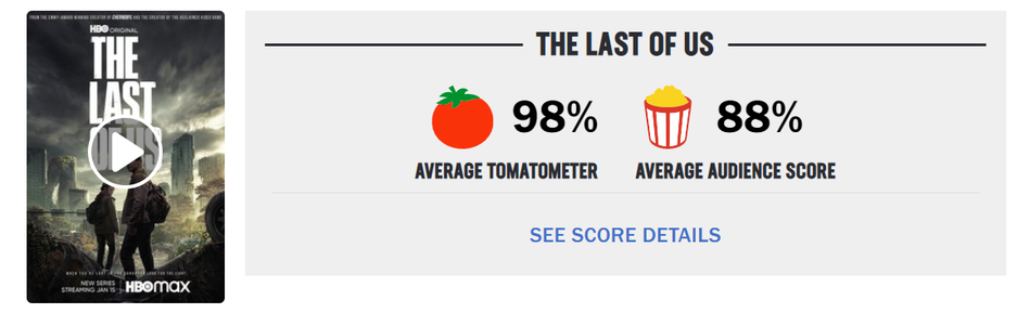 На текущий момент у сериала The Last of Us от HBO рейтинг критиков 98%, а зрительский рейтинг 88%.
