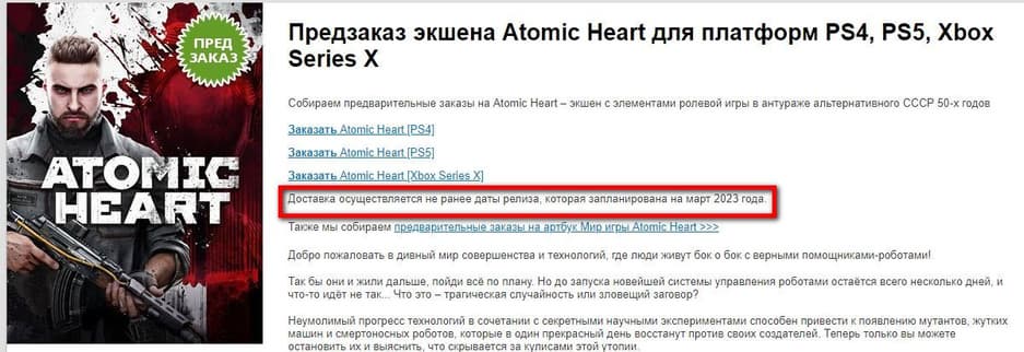 Магазин «1С Интерес» начал принимать предварительные заказы на дисковые версии шутера Atomic Heart. В ассортименте версии для PlayStation 4, PlayStation 5 и Xbox Series X|S, а стоимость составляет 5 999 рублей вне зависимости от платформы. При этом отмечается, что свои заказы покупатели начнут получать не раньше марта 2023 года.