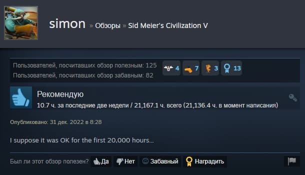 На странице игры в Steam в разделе отзывов simon оставил оценку в виде «пальца вверх» и написал небольшой отзыв после того, как провёл в Civilization V 21 167 часов: