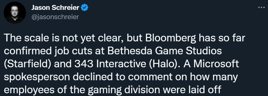 Шрейер написал: «Компания Microsoft увольняет 10 000 человек, в том числе в своих игровых подразделениях, таких как Xbox и Bethesda. Это массовое увольнение происходит ровно через год после того, как Microsoft объявила о планах приобрести Activision Blizzard за 69 миллиардов долларов [т.е. в случае приобретения компании автоматически прибавятся новые сотрудники из AB]».