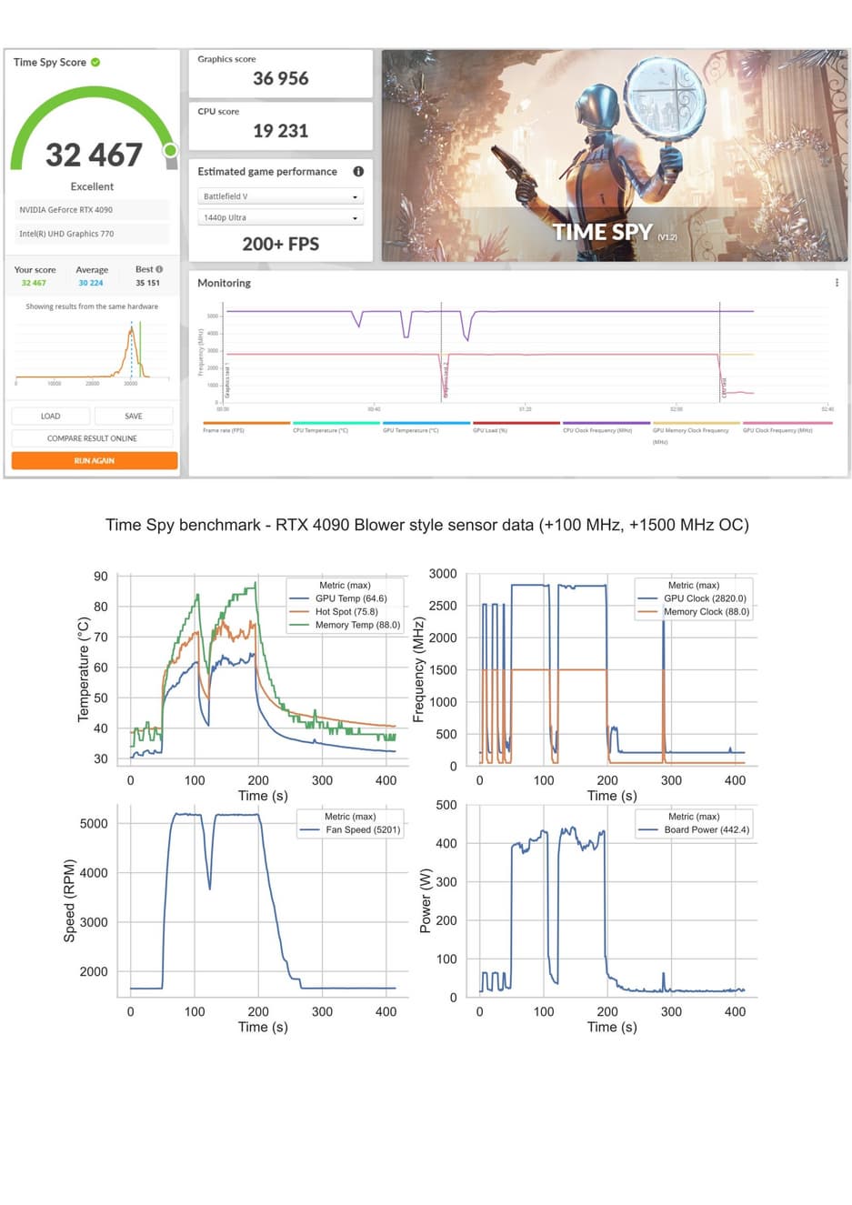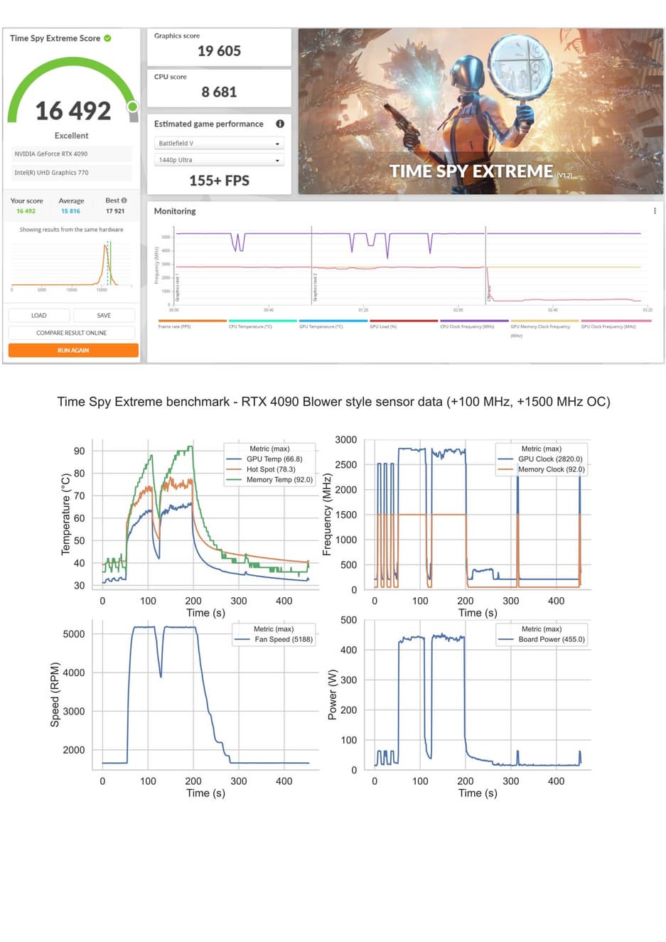 Судя по тестам, такая система охлаждения тонкой GeForce RTX 4090 вполне успешно работает. Рабочая температура в пределах 60-70 градусов (видеокарту не разгоняли).