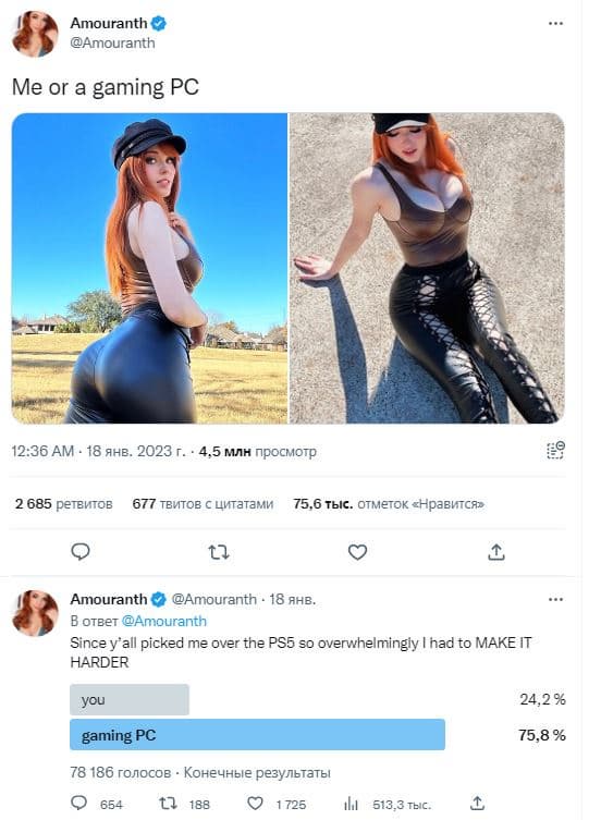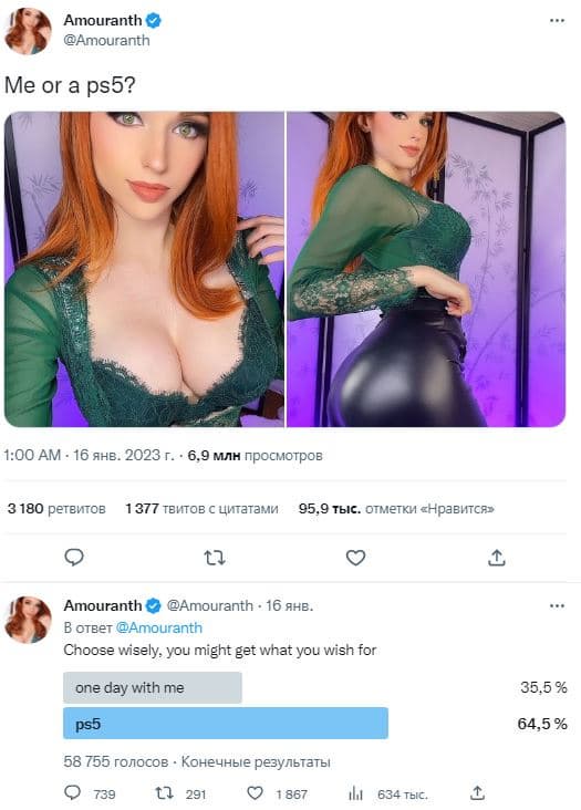 Кейтлин Мишель Сирагуса, больше известная в сообществе как торгующая фотографиями голой себя и плещущаяся в бассейне перед камерой стримерша-онлифанщица Amouranth, провела на своей странице Twitter голосование. Людям предложили выбор: день с ней или консоль PlayStation 5. Консоль победила почти с двухкратным перевесом.