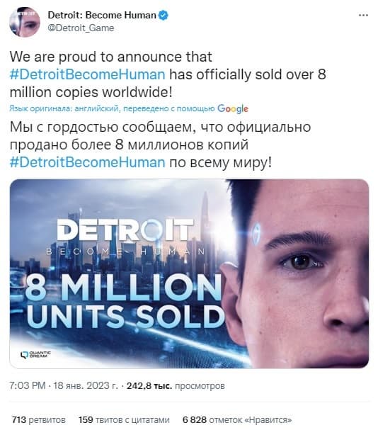 В марте 2022 года разработчики сообщили о продажах 6,5 миллионов копий Detroit: Become Human, а теперь подтвердилось, что цифра была значительно выросла до 8 миллионов.