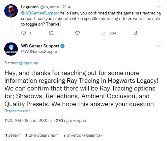 Один из геймеров задал вопрос разработчикам о реализации трассировки лучей. В ответ команда WB Games Support подтвердила, что Hogwarts Legacy получит варианты трассировки лучей для теней, отражений, окклюзии окружения и в пресетах.