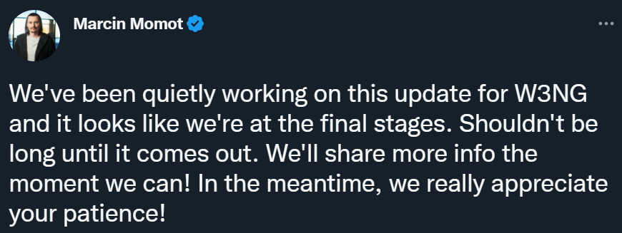 Марчин заявил: «Мы потихоньку работали над обновлением для The Witcher 3 Next-Gen и, похоже, подошли к финальной стадии. До релиза обновления осталось не так уж и долго. Мы поделимся дополнительной информацией, как только сможем! Мы очень ценим ваше терпение!».