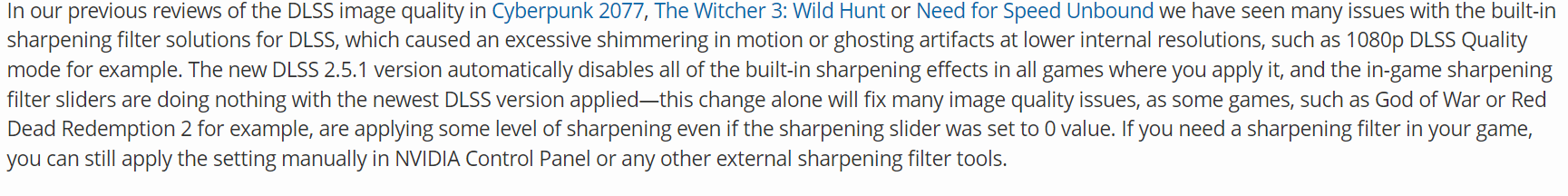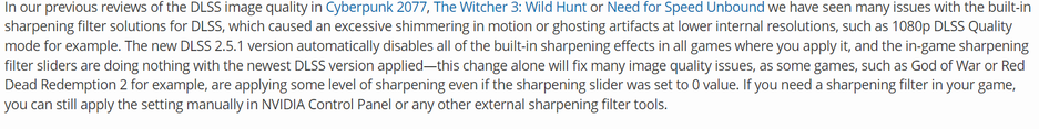 Уточнили, что новая версия DLSS 2.5.1 автоматически отключает все встроенные эффекты повышения резкости; ползунки повышения резкости перестают на что-то влиять, это должно исправить многие проблемы, т.к. в некоторых играх даже при установке нулевого значения могло оказываться некоторое влияние. Фильтр можно будет включить вручную через панель управления NVIDIA или иной подобный инструмент.